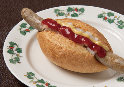 自社製パンに無塩せきソーセージをはさんで焼き上げ、刻み玉ねぎとケチャップ、マスタードで仕上げています。