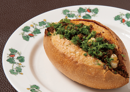 玉ねぎをじっくり炒めてつくったコクのあるスープで、ロールキャベツ、トマト、玉ねぎを煮込みました。自社製パンをスープに浸してお召し上がりください。