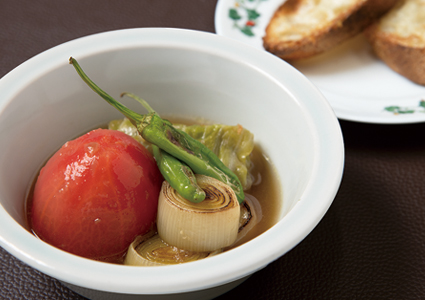 玉ねぎをじっくり炒めてつくったコクのあるスープで、ロールキャベツ、トマト、音更町たけなかファームのポロネギを煮込みました。自社製パンをスープに浸してお召し上がりください。