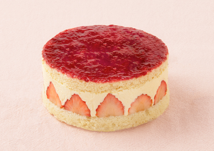 苺の半切りを並べ、ムースリーヌを絞りました。中には食感のある果肉入り苺ジャムが入っています。