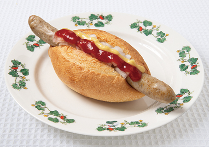 自社製パンに無塩せきソーセージをはさんで焼き上げ、刻み玉ねぎとケチャップ、マスタードで仕上げています。