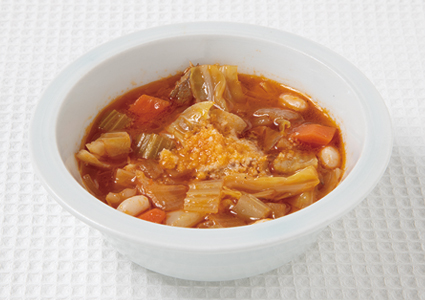 玉ねぎ、人参、キャベツなどの野菜と手亡豆をトマトベースで仕上げ、パルメザンチーズをかけました。