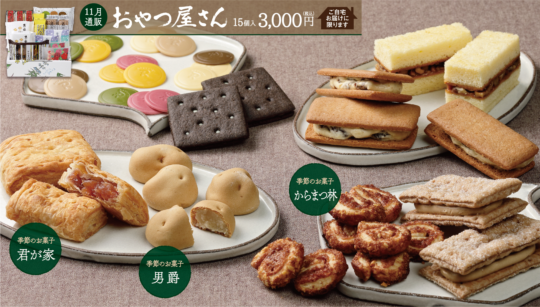 毎月変わる、オリジナル詰合せ『通販おやつ屋さん』。