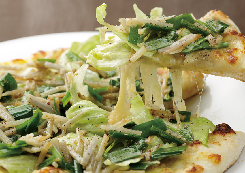 帯広・和田農園のごぼうでつくった特製ソースを生地に広げ、百鬼ドレッシングで和えたごぼう、レタス、ニラのサラダで仕上げました。
